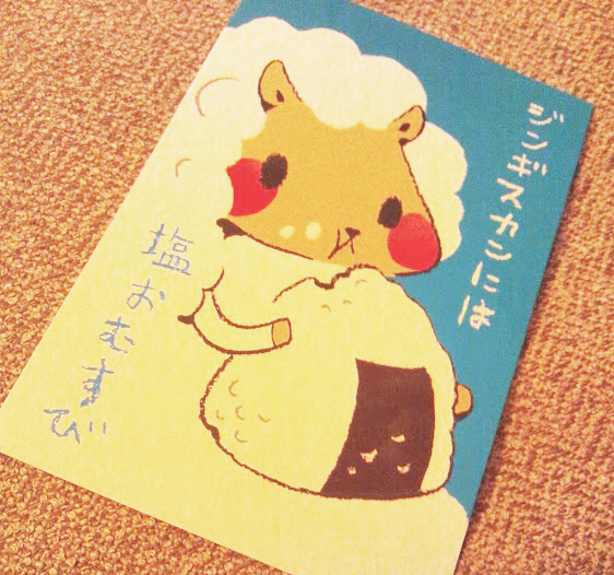 昨日夕立ちが来て、傘と、重たいスーパーの買い物の荷物とを持ってムシムシの中帰宅した時、ポストに入っていた北海道の友人からの暑中お見舞いのはがき。このあまりの可愛らしさに疲れが吹っ飛んじゃいました。
